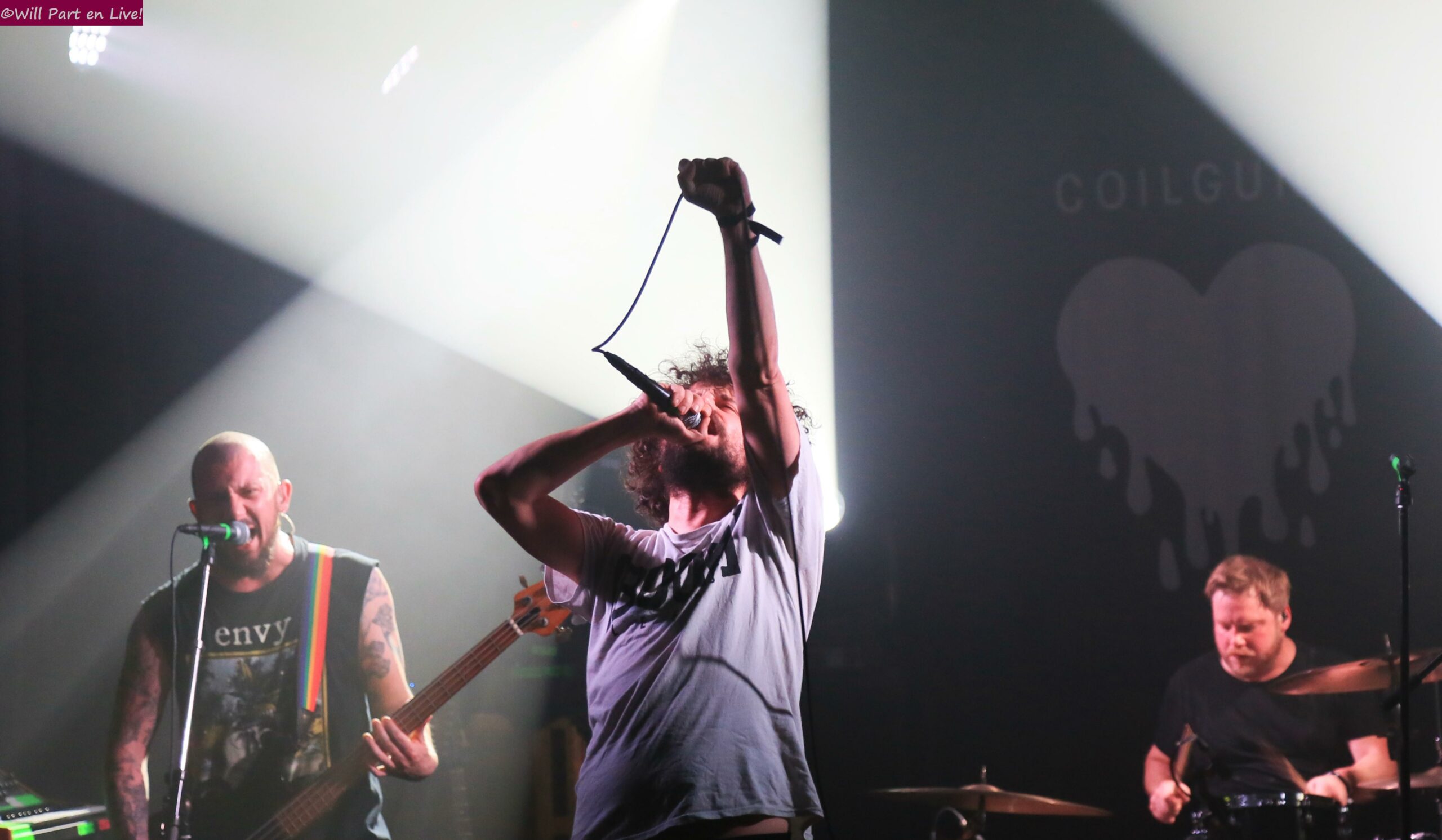 Hardcore furieux, propos anti-tout ce qui part en c+++++++, énergie viscérale et compositions, dans le genre, plus qu’élevées. Split dévaste, soucieux de la réaction de la Lune le leader n’a plus à s’en faire. Même l’ami disquaire Tom Taup’s, habitué à débouler tard, est pour le coup venu bien tôt. L’étendue est de plus audible, Split flirtant avec l’indus, la noise et le dégoût total d’une société qui le révulse. Split n’est pas figé, son ire est assez plurielle pour mainteneur l’intérêt. Violent, il en met plus d’un(e) sur le flanc. Il finit suant, son implication est débordante. On tente de s’en remettre, sonné. Coilguns se prépare, là aussi ça sent l’assaut débridé. Après une série de sincères poignées de mains, Louis Jucker débute les contorsions et la noise matinée de post-hardcore des Helvètes esthètes commence à faire trembler les murs. Quelques notes dépaysantes s’incrustent, la rage tantôt se module et s’il faut le suivre dans ses méandres, il va sans dire que Coilguns impressionne. Ses convulsions frappent fort, ses geysers instrumentaux font sensation et de tout ça transparait une forme d’ « Amour Etrange » qui rassénère son monde. Le sieur Jucker fend la foule, slamme, monté sur les ressorts de nos tristes sorts. Il n’empêche, la raclée vécue en allège le poids.